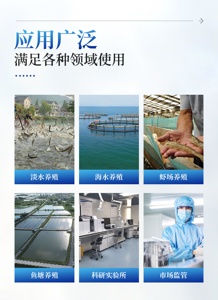 适用于纯净水厂、自来水厂、生活污水处理厂、工业污水、水产养殖、河流监测、游泳场馆、水源保护、生产监测、科研实验等。