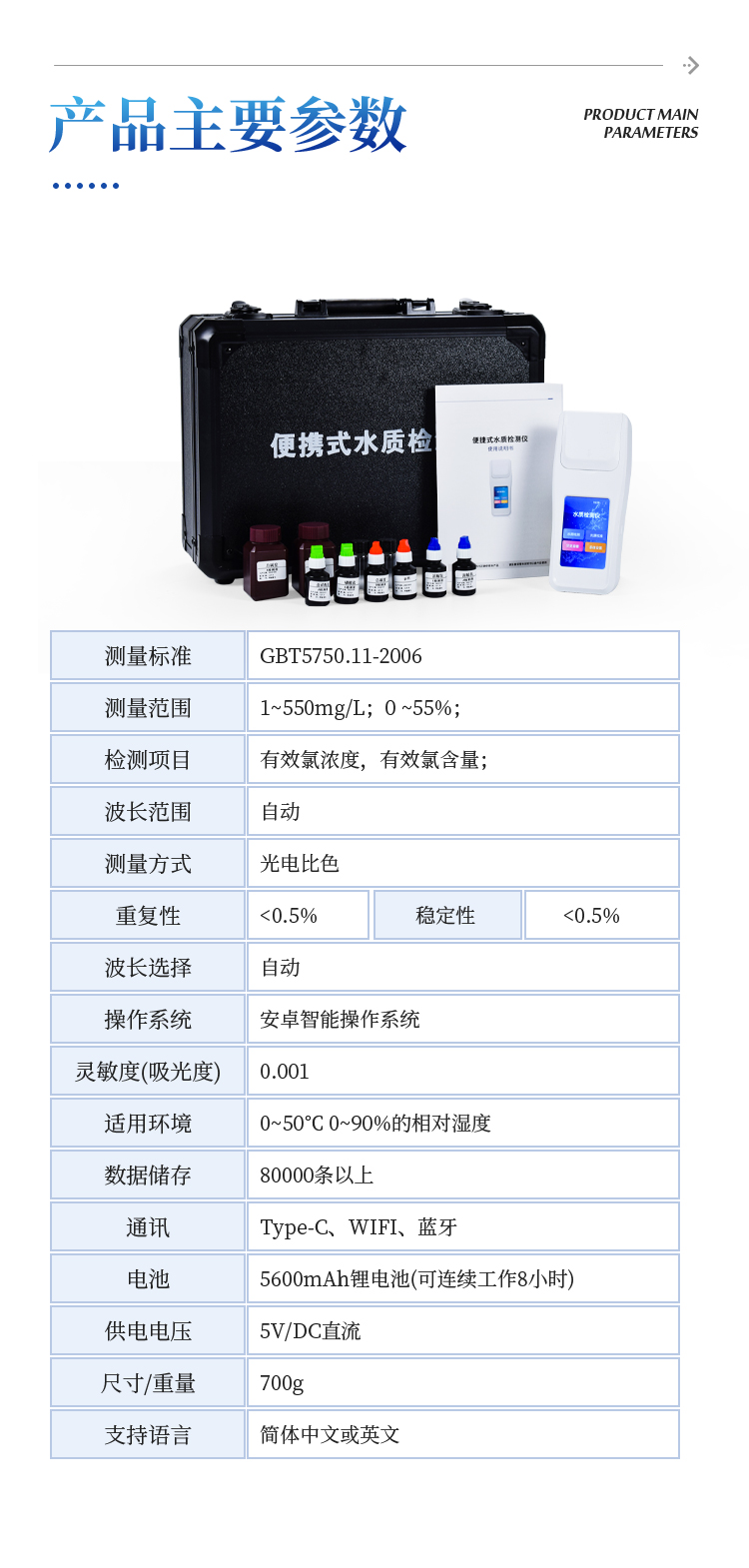 能够广泛应用于食品厂、医院、污水处理、饲养中心、水产养殖、消毒化粪池等有效氯浓度检测;也适用于漂白粉、漂粉精片及一些类似的消毒剂中有效氯含量的测定,以便制备合格的消毒水达到国家规定的消毒标准。