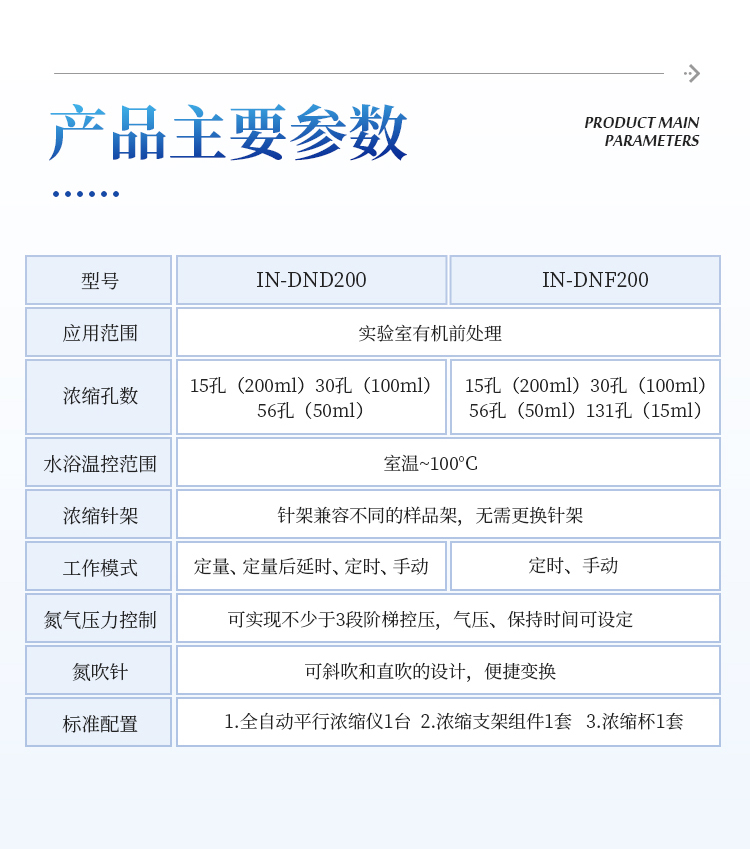 简要描述: IN-DND200定量全自动氮吹浓缩仪 采用三面玻璃可视化设计,可在左右两个侧面及正面均可看到浓缩管的浓缩情况,氮吹针自动跟随液面下降,下降速度可调,并可中途手动调节喷针的升或降而无需停止自动下降,水浴槽内预设抽水阀,一键点击,轻松自动排水。
