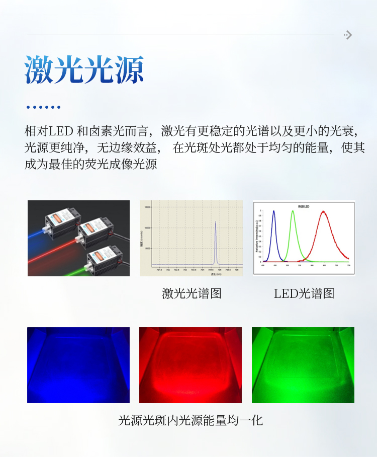 激光光源:相对LED 和卤素光而言,激光有更稳定的光谱以及更小的光衰,光源更纯净,无边缘效益, 在光斑处光都处于均匀的能量,使其成为最佳的荧光成像光源。