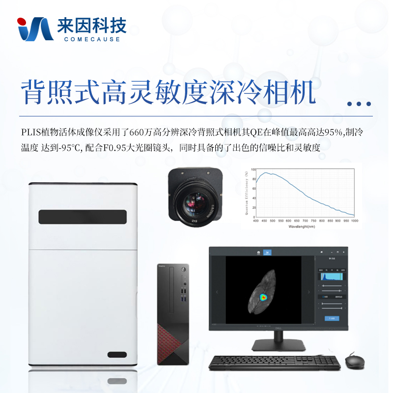 背照式高灵敏度深冷相机:PLIS植物活体成像仪采用了660万高分辨深冷背照式相机其QE在峰值最高高达95%,制冷温度 达到-95°C, 配合F0.95大光圈镜头,同时具备的了出色的信噪比和灵敏度。