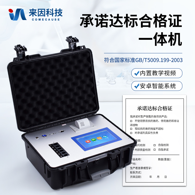 山东来因光电科技有限公司是一家专业生产食品快检仪器的高新技术企业。我公司根据农村农业部办公厅关于《加快推进承诺达标合格证制度试行工作的通知》,在原有的食用农产品合格证检测打印一体机的基础上优化了打印标签,使打印标头和打印内容符合承诺达标合格证的最新要求。该仪器集农药残留快速检测和承诺达标合格证打印于一体,智能化程度高,在快速检测的同时实现承诺达标合格证的打印。打印内容包含:承诺声明、承诺依据、农产品名称、数量(重量)、产地、生产者盖章或签名、联系方式、开具日期等信息,合格证下方自动跟随二维码打印,扫描二维码可实现自动追溯。实现农产品安全的全程数据溯源,适合各地检测机构、农业合作社、蔬菜批发市场等单位使用。