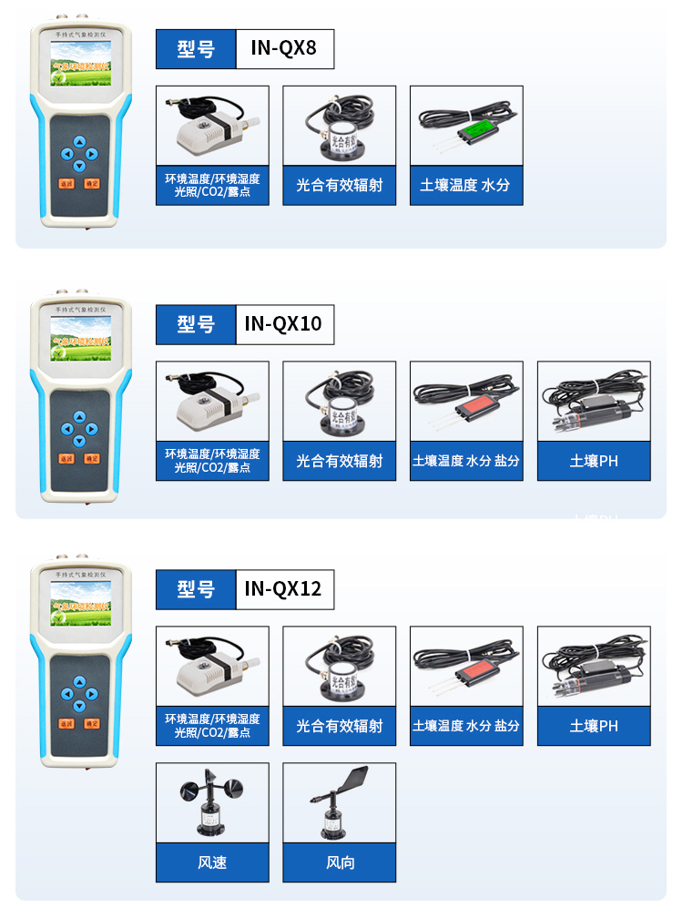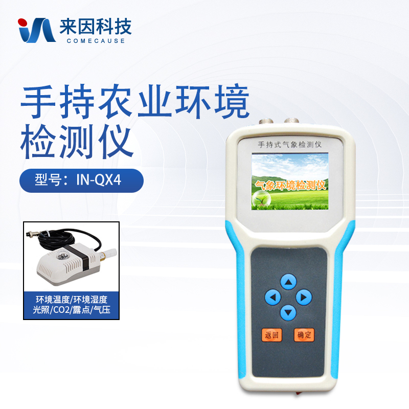 简要描述: 手持式智能农业气象环境检测仪IN-QX4是妖精视频在线免费观看专门针对农田、草场局部小尺度环境设计的,对与植被和农作物生长密切相关的土壤、水气等环境参数监测的农田小气候站。它主要观测与农业相关的空气温度、空气湿度、光照强度、二氧化碳浓度等4个环境参数气象要素,为农业科研、农业生产等提供良好的支持。