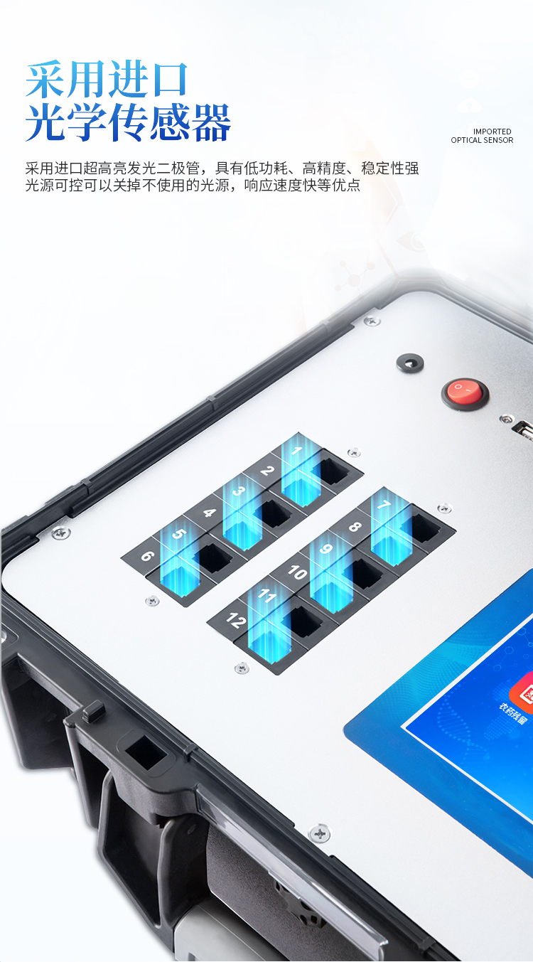 4、四波长冷光源,18个检测通道,每个通道均配置410、520、590、630nm波长光源,标配先进的光路切换装置,专业光路切换功能可实现最多64波长,并且所有检测项目可实现所有通道同时检测。