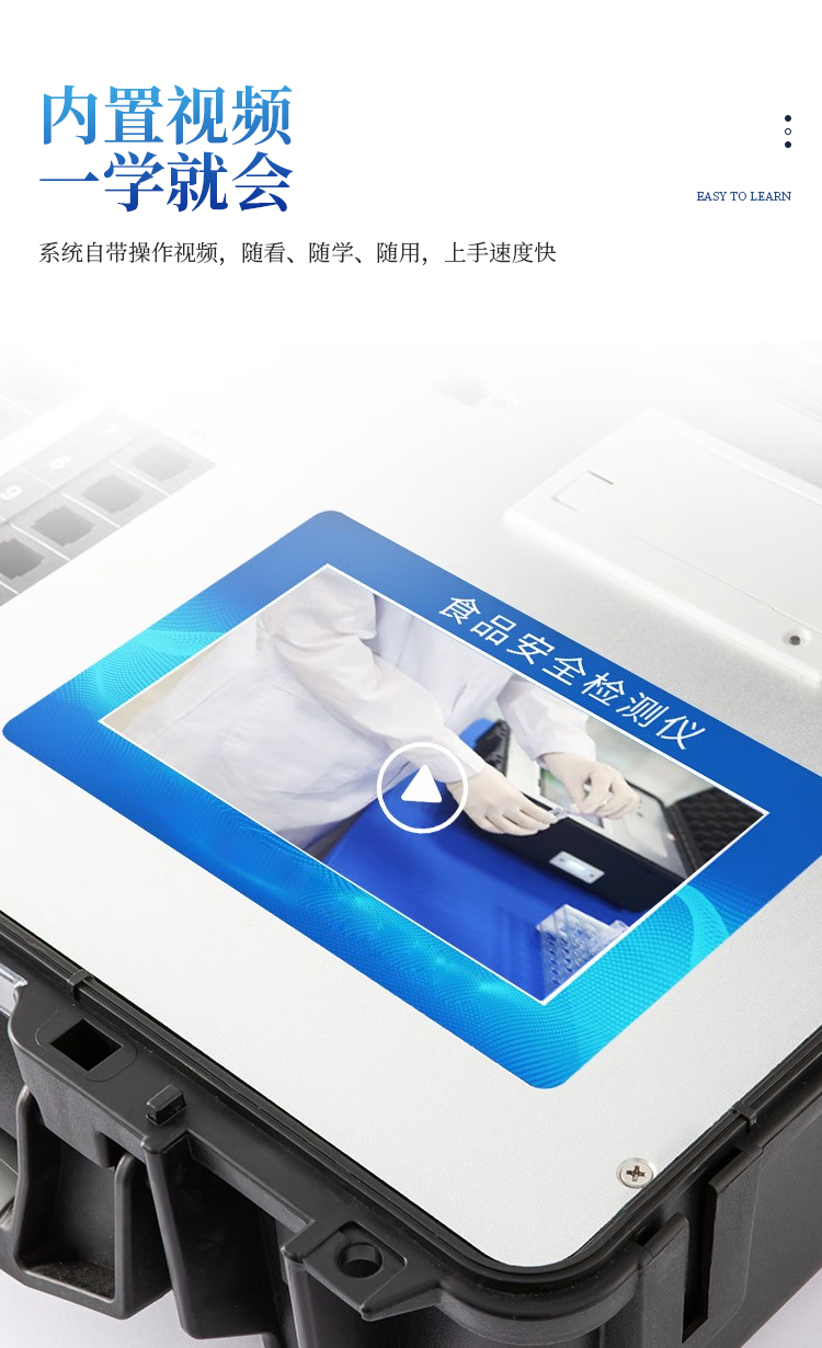 多功能食品安全检测仪可快速检测200多项目,包含非食用化学物质、滥用食品添加剂、农药残留、兽药残留、重金属、病害肉、营养强化剂、抗生素类残留、激素类残留、真菌毒素类残留、化学类残留等现场的定性定量检测。