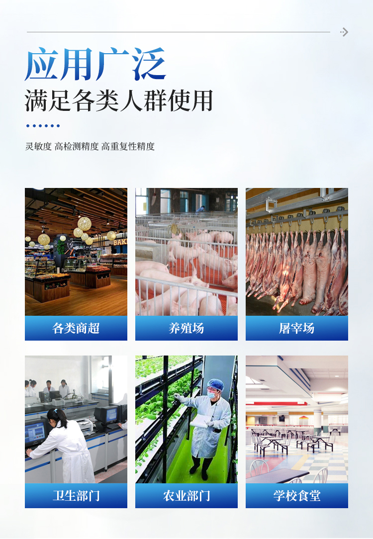 该多功能肉类检测仪为集成化肉品安全快速检测分析设备,广泛应用于各类商超、批发市场、养殖场、屠宰场、食品肉产品深加工企业、检验检疫部门、食药监局、卫生部门、高教院校、科研院所、农业部门等单位使用。