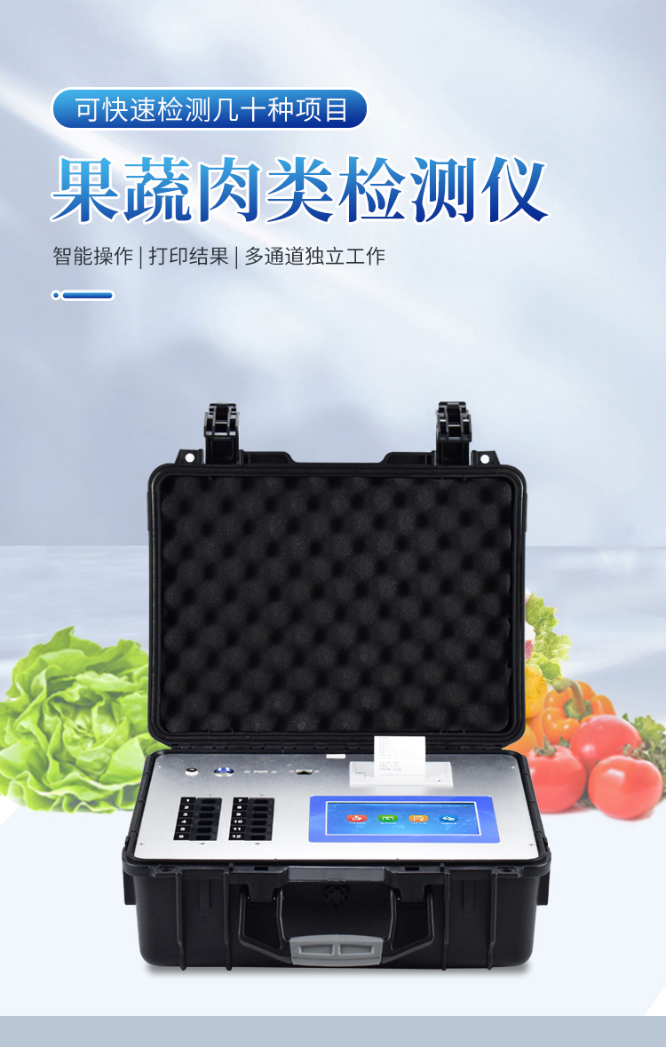 多功能果蔬肉类检测仪可快速检测几十种项目,包含各种蔬菜水果中有机磷、氨基甲酸酯类农药,病害肉诊断:肉类新鲜度、肉中组胺、挥发性盐基氮;各种肉食品中瘦肉精激素类残留等现场的定性定量检测。