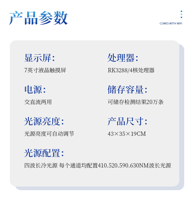 4、四波长冷光源,12个检测通道,每个通道均配置410、520、590、630nm波长光源,标配先进的光路切换装置,专业光路切换功能可实现最多64波长,并且所有检测项目可实现所有通道同时检测。