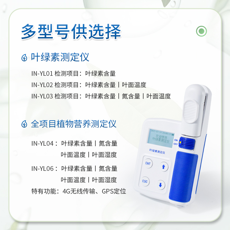 叶绿素测定仪根据叶绿素光谱吸收规律,采用两种不同的发光管照射叶片,通过测量透过叶片的光的强度计算出叶片内的叶绿素相对含量或者绿色程度,从而为合理、适当、及时施肥提供可靠的科学依据,广泛应用于农业、林业、植物等科学研究和生产指导。