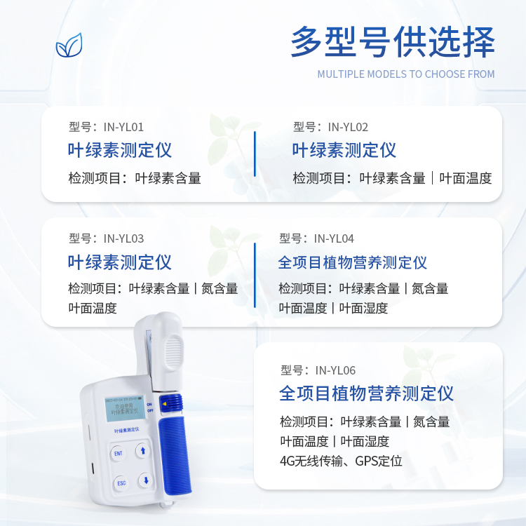 简要描述: 叶绿素测定仪IN-YL04是一种用于测量植物叶片中叶绿素含量的设备。叶绿素是植物中的主要光合色素,它们吸收光能并参与光合作用,将光能转化为化学能以供植物生长和发育所需。测量叶绿素含量可以提供有关植物生理状态、光合活性以及叶片受到的胁迫或病害的信息。