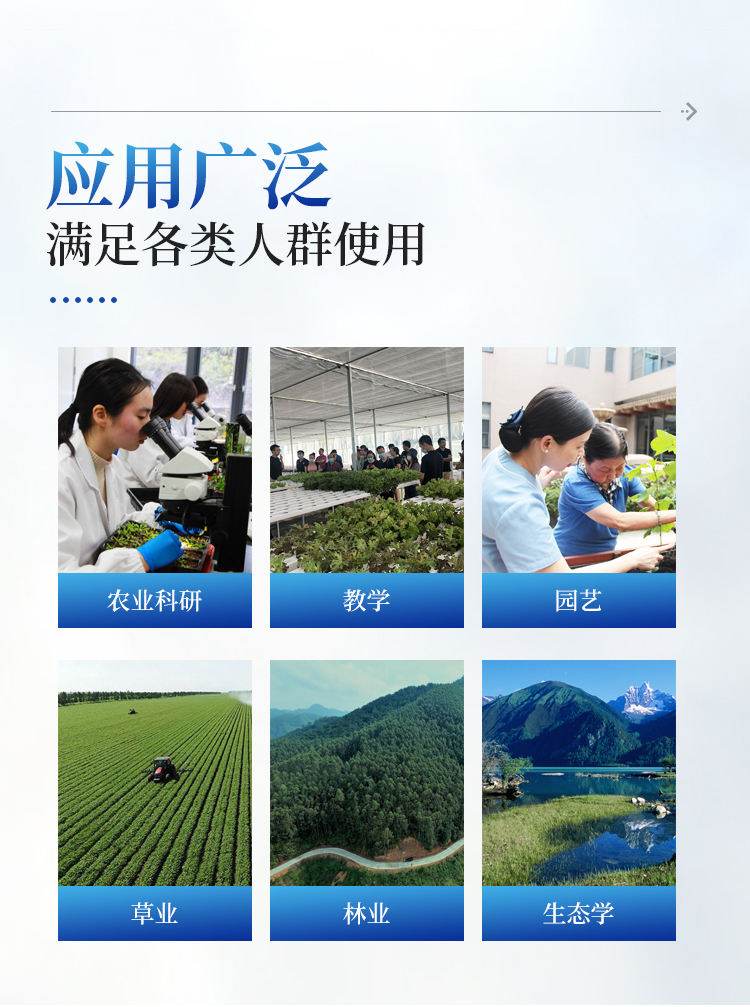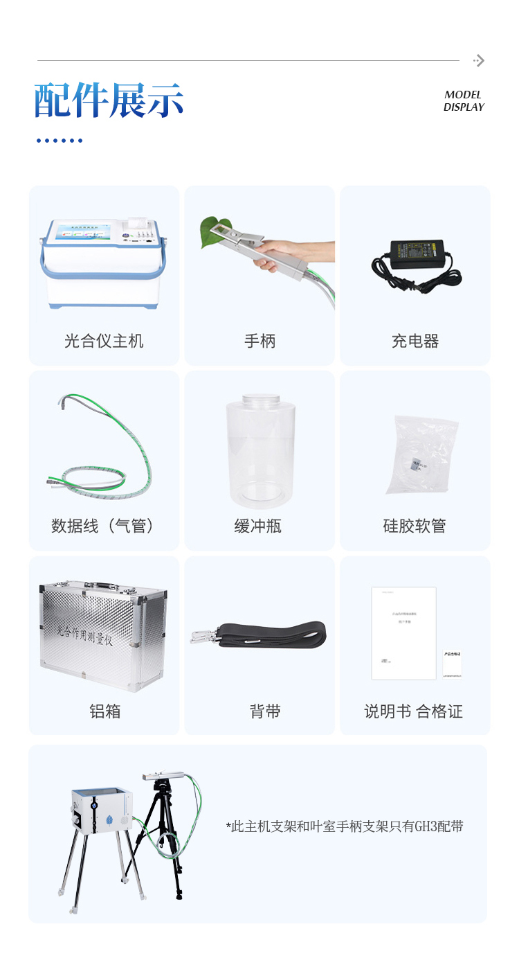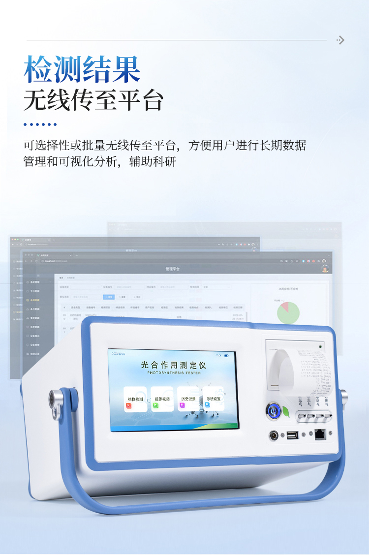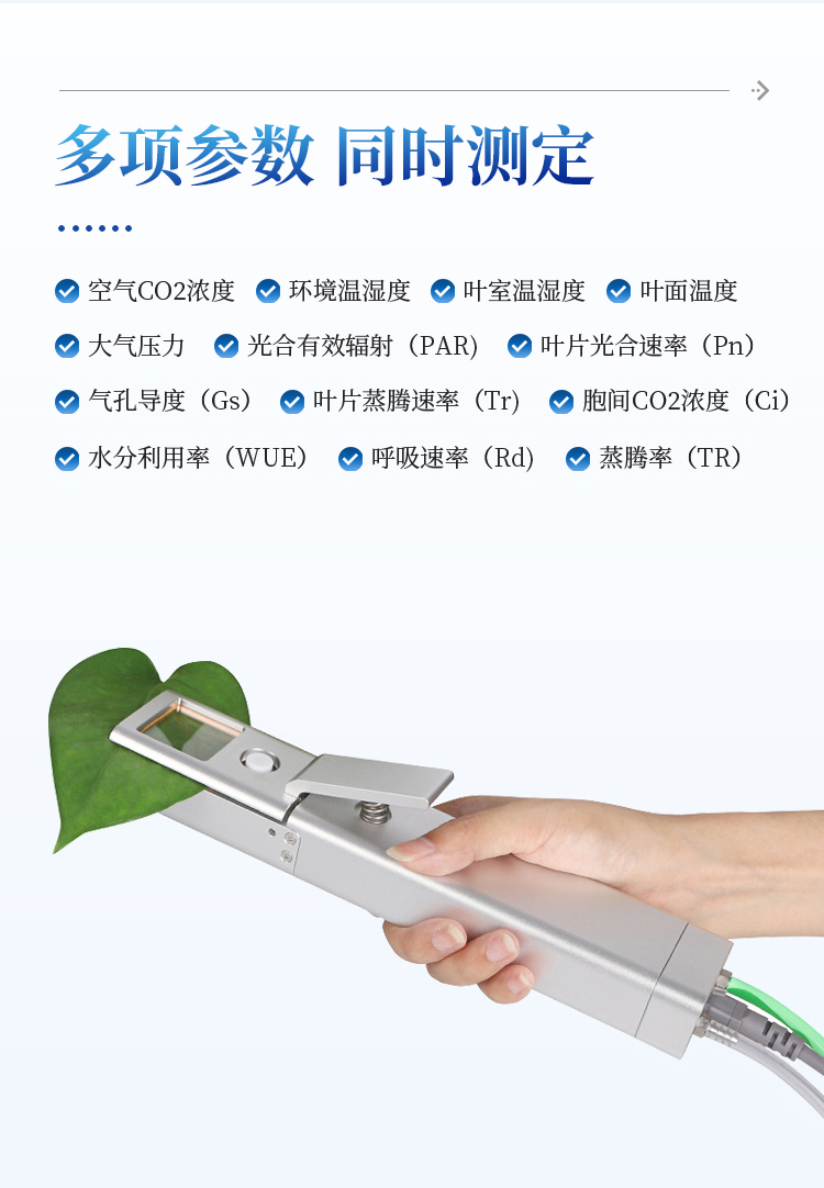 •多功能:同时测定光合速率、蒸腾速率、胞间二氧化碳浓度、气孔导度和水分利用效率,以及二氧化碳浓度、相对湿度、光合有效辐射和空气温度、叶片温度、大气压力等指标;