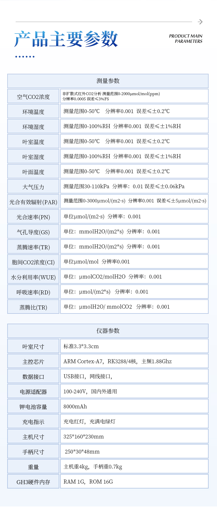 空气CO2浓度:非扩散式红外CO2分析 测量范围0-3000μmol/mol(ppm) 分辨率0.0005 误差≤3%FS
